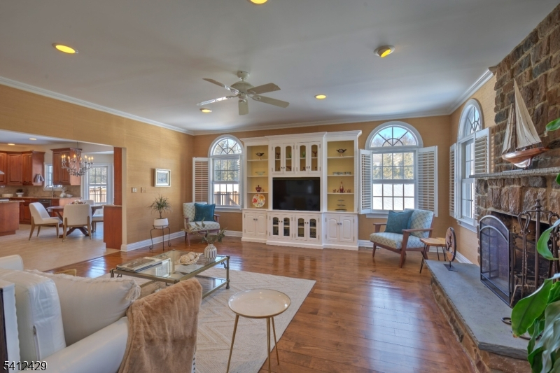 Stately 5 bedroom, 3.5 bath custom Colonial with lovely front porch in Bernardsville. A thoughtfully designed living space includes a two-story foyer with custom wainscoting & sweeping staircase. Custom molding accents in every room & beautiful walnut Brazilian teak floors in main rooms; living room, office, dining room and family room. Wood burning fireplace with handsome stone surround, custom built-in cabinetry & plantation shutters in the family room. The heart of the home kitchen includes newer stainless steel appliances, granite countertops, double wall oven and abundant custom cabinetry. A built-in desk, walk-in pantry and dry bar add style and function, while sliding glass doors from the breakfast area lead to the expansive deck overlooking the rear yard. A convenient back staircase leads from the master suite to the laundry room. The primary suite includes a sitting room, 2 large walk-in closets with custom built-ins and a gas fireplace. A sumptuous bathroom with double vanities, a jetted tub and separate shower stall complete this oversized suite. Two bedrooms share the hall bathroom and the two remaining bedrooms are connected by a shared bathroom. All the bedrooms as well as the primary suite and upper hallway are also hardwood with custom moldings. A walk-up attic w/high ceilings & windows offers potential for future expansion or expansive storage. The newly refinished basement adds extra living space to the home. Generator. 3 car garage with additional storage