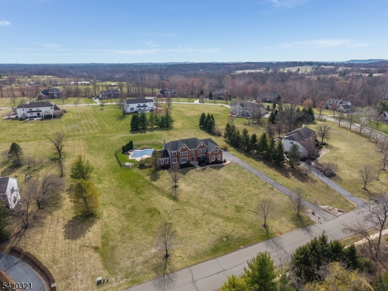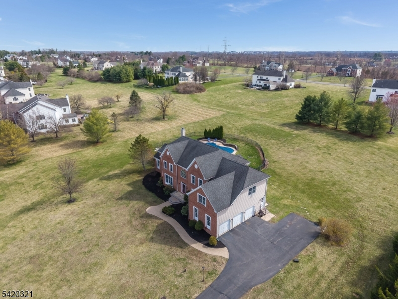 Impressively situated amid the rolling hills of Hopewell Valley, this stately home reflects a perfect balance of elegance and comfort. Soaring ceilings, abundant natural light, and a floorplan designed for effortless flow. Spectacular kitchen with stainless steel high-end appliances, island seating, and a generous breakfast area opening to a cozy sunroom. Entertaining is a breeze with an expansive patio surrounding a gunite pool & hot tub, enhanced by cool deck heat-reflective coating. Owned solar panels provide a respite from electric bills; owners report most months they have no electric bill at all, even with two EV chargers. First floor bonus rooms include a private home office and conservatory/game room. Formal powder room near the foyer. Convenient laundry/mud room with second powder room. Upstairs, the large master suite is a combined bedroom and relaxing informal sitting room, with a large walk-in closet. Its ensuite bathroom features two separate vanity areas, a corner jacuzzi tub, and a Japanese commode. Four additional bedrooms serviced by two Jack & Jill bathrooms. Immense walk-out basement is ready for finishing. Enjoy the advantages of a prestigious enclave of homes, High Pointe at Hopewell community in Pennington. Spectacular location overlooking beautiful open space: a nature trail maintained by Friends of Hopewell Valley is directly across the street.